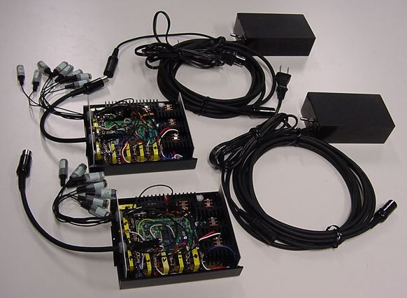 Finally, I report the newest development of a compact and light 8-channel biological feedback system (below). The feedback signal is high voltage (10V-100V) electric pulses like "low frequency massage" device (below)). The waveshape, voltage and density of pulses are real-time controlled with MIDI from the system. The purposes of this feedback are: (1) detecting performer's cues from the system without being understood by audience, (2) delicate control of sounds and graphics with the feedback feeling in virtual environment, (3) live performance of outside of anticipation with the electric trigger.![]()