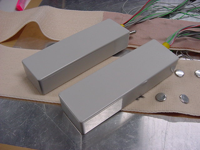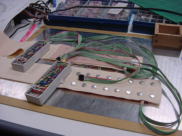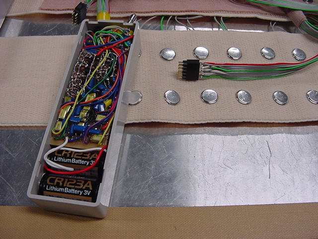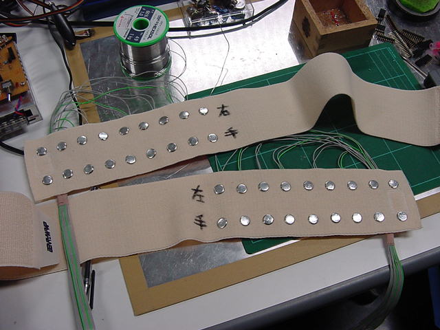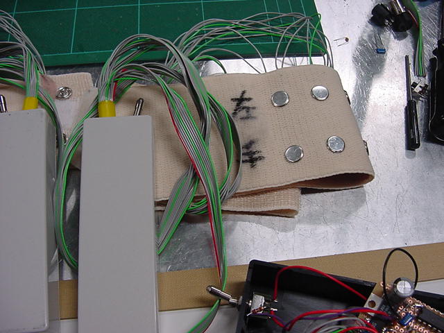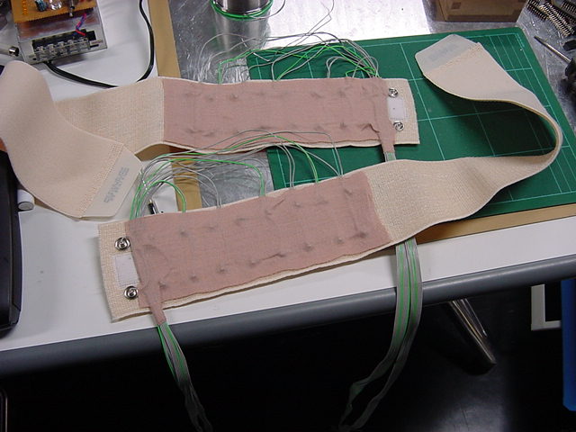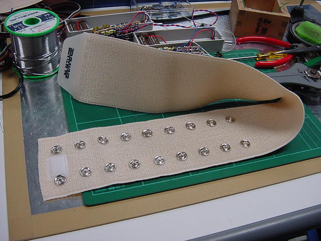 これが今回の電極です。介護用伸縮ベルトに、金属ボタンをカシメて、