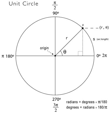 ここまでは第1象限、つまりθの角度の頂点を原点としてθが0度から90度までの範囲だが、正の値の辺を持つ三角形を離れて、θをぐるりと一周する「三角関数」に概念を拡大すると、以下のように、「辺」という概念は正負の領域に広がった変数となる。 ここでは、三角比は「比」なので、円の半径に依存しないことから、「単位円(unit circle)」として半径1の円を考える。 また、角度θも「度」から「ラジアン(radian)」に拡張される。180度がπラジアンである。