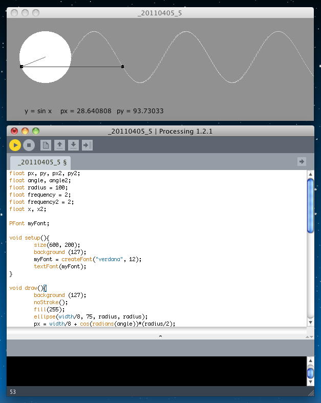 上の書き方は一般的な数学での表記であり、Processingでは以下のように表現する。x = cosine(theta) * radius y = sine(theta) * radius 角度については、thetaと書いたらラジアン単位、angleと書いたら「度」なので、これらの相互変換は以下の計算で行える。 piはもちろん円周率である。float x = cos(radians(angle)) * radius; float y = sin(radians(angle)) * radius; この変換のために、Processingでは以下の関数「radians」「degrees」が提供されている。theta = angle*pi/180 angle = theta*180/pi 単位円での定義から、三角関数は円周上の点の回転移動そのものに関係していることは明白だが、これをアニメーションで示したProcessingのサンプルがあった。 アプレットとして書き出してみると、このようになった。theta = radians(angle) angle = degrees(theta) float px, py, px2, py2; float angle, angle2; float radius = 100; float frequency = 2; float frequency2 = 2; float x, x2; PFont myFont; void setup(){ size(600, 200); background (127); myFont = createFont("verdana", 12); textFont(myFont); } void draw(){ background (127); noStroke(); fill(255); ellipse(width/8, 75, radius, radius); px = width/8 + cos(radians(angle))*(radius/2); py = 75 + sin(radians(angle))*(radius/2); rectMode(CENTER); fill(0); rect (px, py, 5, 5); stroke(100); line(width/8, 75, px, py); stroke(200); angle2 = 0; for (int i = 0; i< width; i++) { px2 = width/8 + cos(radians(angle2))*(radius/2); py2 = 75 + sin(radians(angle2))*(radius/2); point(width/8+radius/2+i, py2); angle2 -= frequency2; } noStroke(); ellipse(width/8+radius/2+x, py, 5, 5); angle -= frequency; x+=1; if (x>= width-60) { x = 0; angle = 0; } stroke(50); line(px, py, width/8+radius/2+x, py); text("y = sin x", 35, 185); text("px = " + px, 105, 185); text("py = " + py, 215, 185); }
