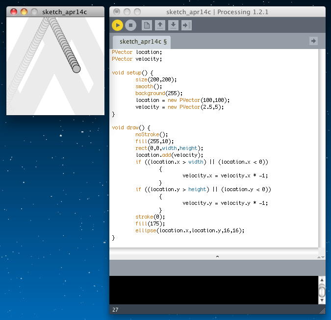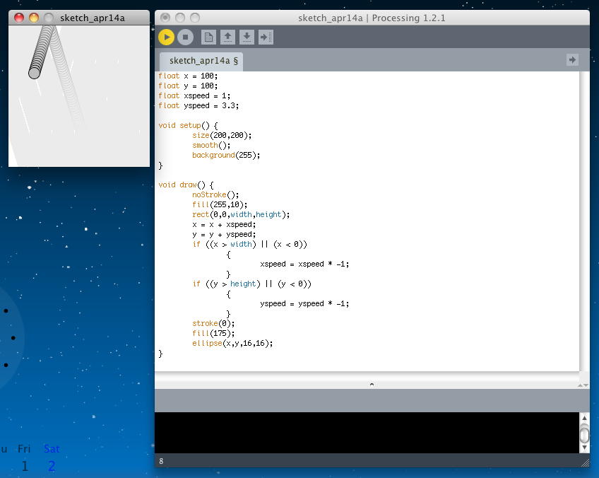 float x = 100; float y = 100; float xspeed = 1; float yspeed = 3.3; void setup() { size(200,200); smooth(); background(255); } void draw() { noStroke(); fill(255,10); rect(0,0,width,height); x = x + xspeed; y = y + yspeed; if ((x > width) || (x < 0)) { xspeed = xspeed * -1; } if ((y > height) || (y < 0)) { yspeed = yspeed * -1; } stroke(0); fill(175); ellipse(x,y,16,16); }