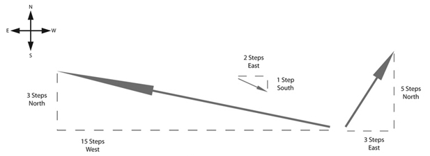 - (-15, 3) → Walk fifteen steps west, turn and walk three steps north.