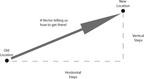 技術的には、ベクトルとは以下のように、「2点間の座標の差分」である。 ある場所から他の場所に行く時に、「北に何歩」「東に何歩」と指定するのと同じである。 京都市内で言えば「百万遍から東大路通を北に50m、今出川通を東に200mの場所」が京大理学部である、というようなものである。Vector location; Vector speed;