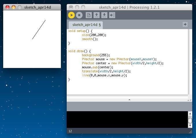 void setup() { size(200,200); smooth(); } void draw() { background(255); PVector mouse = new PVector(mouseX,mouseY); PVector center = new PVector(width/2,height/2); mouse.sub(center); translate(width/2,height/2); line(0,0,mouse.x,mouse.y); }