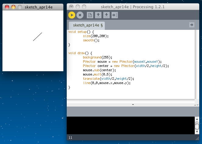 void setup() { size(200,200); smooth(); } void draw() { background(255); PVector mouse = new PVector(mouseX,mouseY); PVector center = new PVector(width/2,height/2); mouse.sub(center); mouse.mult(0.5); translate(width/2,height/2); line(0,0,mouse.x,mouse.y); }