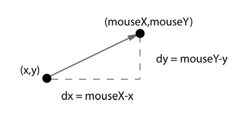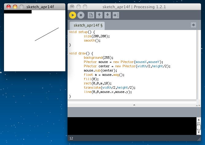 void setup() { size(200,200); smooth(); } void draw() { background(255); PVector mouse = new PVector(mouseX,mouseY); PVector center = new PVector(width/2,height/2); mouse.sub(center); float m = mouse.mag(); fill(0); rect(0,0,m,10); translate(width/2,height/2); line(0,0,mouse.x,mouse.y); }