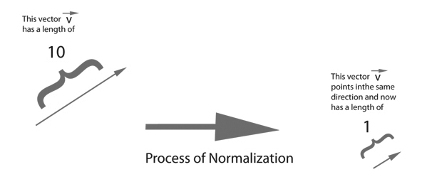 ベクトルに対する次の関数は「normalize()」である。これはベクトルの方向を変えずに、その長さを「単位ベクトル」、つまり長さ=1に変換する。 演算としては以下のように、ベクトルの各成分を、そのベクトルの大きさで割ればよい。 当然ながら、ゼロベクトルには定義されない。