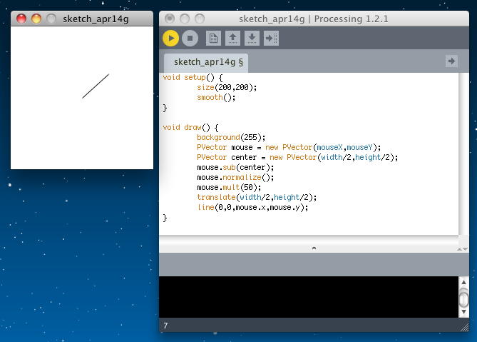 void setup() { size(200,200); smooth(); } void draw() { background(255); PVector mouse = new PVector(mouseX,mouseY); PVector center = new PVector(width/2,height/2); mouse.sub(center); mouse.normalize(); mouse.mult(50); translate(width/2,height/2); line(0,0,mouse.x,mouse.y); }