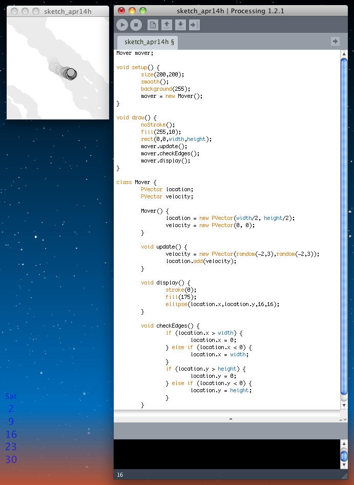 Mover mover; void setup() { size(200,200); smooth(); background(255); mover = new Mover(); } void draw() { noStroke(); fill(255,10); rect(0,0,width,height); mover.update(); mover.checkEdges(); mover.display(); } class Mover { PVector location; PVector velocity; Mover() { location = new PVector(width/2, height/2); velocity = new PVector(0, 0); } void update() { velocity = new PVector(random(-2,3),random(-2,3)); location.add(velocity); } void display() { stroke(0); fill(175); ellipse(location.x,location.y,16,16); } void checkEdges() { if (location.x > width) { location.x = 0; } else if (location.x < 0) { location.x = width; } if (location.y > height) { location.y = 0; } else if (location.y < 0) { location.y = height; } } }