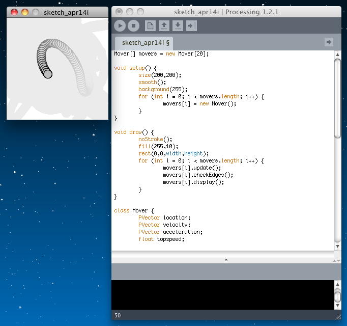 Mover[] movers = new Mover[20]; void setup() { size(200,200); smooth(); background(255); for (int i = 0; i < movers.length; i++) { movers[i] = new Mover(); } } void draw() { noStroke(); fill(255,10); rect(0,0,width,height); for (int i = 0; i < movers.length; i++) { movers[i].update(); movers[i].checkEdges(); movers[i].display(); } } class Mover { PVector location; PVector velocity; PVector acceleration; float topspeed; Mover() { location = new PVector(random(width),random(height)); velocity = new PVector(0,0); topspeed = 4; } void update() { PVector mouse = new PVector(mouseX,mouseY); PVector dir = PVector.sub(mouse,location); dir.normalize(); // Normalize dir.mult(0.5); // Scale acceleration = dir; // Set to acceleration velocity.add(acceleration); velocity.limit(topspeed); location.add(velocity); } void display() { stroke(0); fill(175); ellipse(location.x,location.y,16,16); } void checkEdges() { if (location.x > width) { location.x = 0; } else if (location.x < 0) { location.x = width; } if (location.y > height) { location.y = 0; } else if (location.y < 0) { location.y = height; } } }