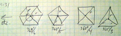 最初の第1ステップは「紙の上でプランを立てる」という事である。 以下のように、半径rの円に内接する正多角形の場合、その円の中心と各頂点を結ぶ線分のなす中心角は、「360度を頂点数で割った角度」というものになる。 これを使うためには、半径と中心角θとを使った三角法が必須となる。