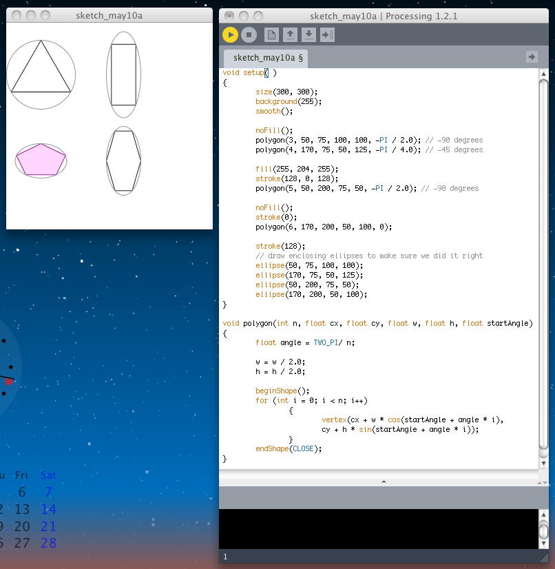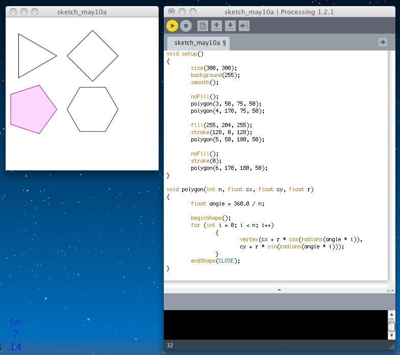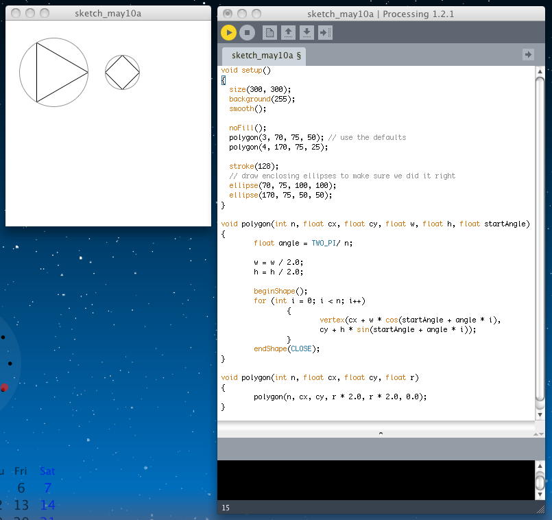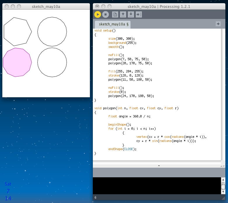 前回の日記が4月14日で、約1ヶ月も空いてしまった。 この間、 将棋 とか 新歓 とか 34虎 とか 誕生日 とかいろいろあって、もうほとんど忘却の彼方であるが、「音楽情報科学」の講義の中でProcessingを紹介したので、 なんとしても進展していかなければならなくなった(^_^;)。 SuperCollider日記 の方も相当に空いてしまっているが、まずはProcessingからである。前回の続きとして、今日は チュートリアル の Anatomy of a Program からである。 ここまではProcessingプログラミングのいろいろな要素を見て来たが、ここでは「プログラムの構造/構想/構成」ということで、 漠然としたアイデアをいかにProcessingで具現化するか、というプロセスを解説する模様である。 具体的な目標として「正多角形を描画する」というテーマを掲げた。