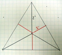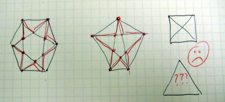 次のトピックは「何が悪かったのか」である。 上の例では、正3角形だけが、何かヘンであった。 これは、中心角の半分のところで、半径方向に一定の割合(propotion)で「引っ込ませる」処理で頂点と同じ数のいわば「補助頂点」を設定し、これと頂点とをジグザグに結ぶ、というその「propotion」が、なんとなく「0.5」に設定されていたからである。 半分もへっこんでいれば星形になるだろう・・・というのが甘かった。 以下のように、正3角形では、ちょうど辺の上がpropotion=0.5の場所であったのだ。