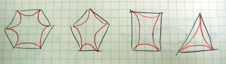 void setup() { size(300, 300); background(255); smooth(); noFill(); polygon(7, 50, 75, 50); polygon(20, 170, 75, 50); fill(255, 204, 255); stroke(128, 0, 128); polygon(11, 50, 180, 50); noFill(); stroke(0); polygon(24, 170, 180, 50); } void polygon(int n, float cx, float cy, float r) { float angle = 360.0 / n; beginShape(); for (int i = 0; i < n; i++) { vertex(cx + r * cos(radians(angle * i)), cy + r * sin(radians(angle * i))); } endShape(CLOSE); }