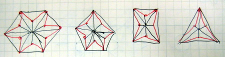まぁ、こんなところにいちいち構っていては楽しいプログラミングが楽しくなくなるので、 何か起きた時にそこで考える(デバッグ)、というのもアリである。(^_^;)void polygon(int n, float cx, float cy, float w, float h, float startAngle) { f (n > 2) { float angle = TWO_PI/ n; . . beginShape() . . endShape(CLOSE); } } さて、次のテーマは「星形を描く」である。 これは以下のようなアイデアスケッチからスタートする。 描いてみれば、何をすればいいのか、判ってくるものである。