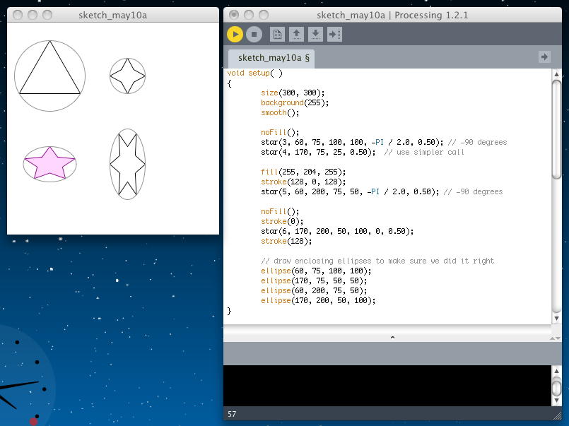 void setup() { size(300, 300); background(255); smooth(); noFill(); star(3, 60, 75, 100, 100, -PI / 2.0, 0.3); // -90 degrees star(4, 170, 75, 25, 0.5); // use simpler call fill(255, 204, 255); stroke(128, 0, 128); star(5, 60, 200, 75, 50, -PI / 2.0, 0.75); // -90 degrees noFill(); stroke(0); star(6, 170, 200, 50, 100, 0, 0.4); stroke(128); // draw enclosing ellipses to make sure we did it right ellipse(60, 75, 100, 100); ellipse(170, 75, 50, 50); ellipse(60, 200, 75, 50); ellipse(170, 200, 50, 100); } void star(int n, float cx, float cy, float r, float proportion) { star(n, cx, cy, 2.0 * r, 2.0 * r, 0.0, proportion); } void star(int n, float cx, float cy, float w, float h, float startAngle, float proportion) { if (n > 2) { float angle = TWO_PI/ (2 *n); // twice as many sides float dw; // draw width float dh; // draw height w = w / 2.0; h = h / 2.0; beginShape(); for (int i = 0; i < 2 * n; i++) { dw = w; dh = h; if (i % 2 == 1) { dw = w * proportion; dh = h * proportion; } vertex(cx + dw * cos(startAngle + angle * i), cy + dh * sin(startAngle + angle * i)); } endShape(CLOSE); } }
