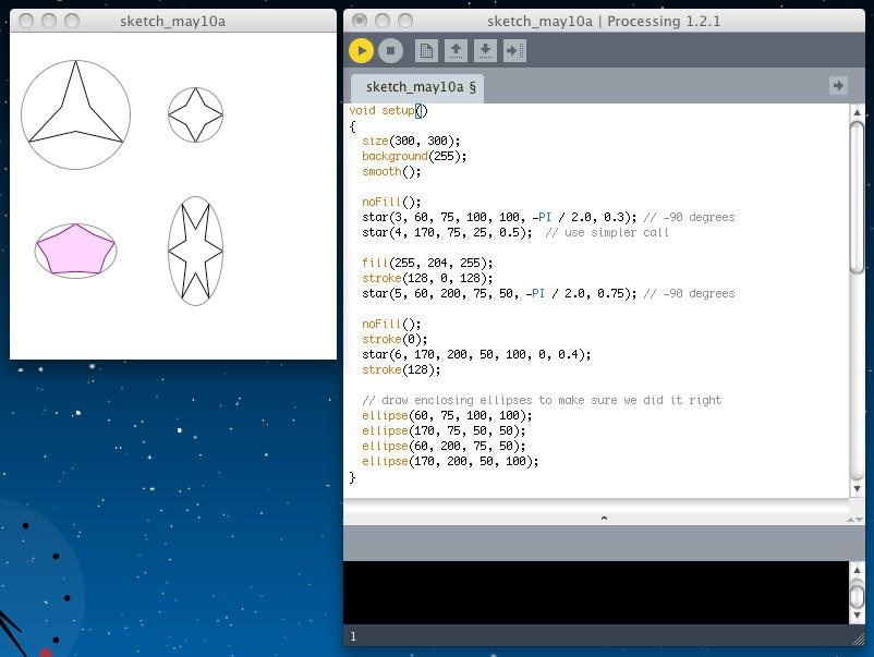void setup( ) { size(300, 300); background(255); smooth(); noFill(); star(3, 60, 75, 100, 100, -PI / 2.0, 0.50); // -90 degrees star(4, 170, 75, 25, 0.50); // use simpler call fill(255, 204, 255); stroke(128, 0, 128); star(5, 60, 200, 75, 50, -PI / 2.0, 0.50); // -90 degrees noFill(); stroke(0); star(6, 170, 200, 50, 100, 0, 0.50); stroke(128); // draw enclosing ellipses to make sure we did it right ellipse(60, 75, 100, 100); ellipse(170, 75, 50, 50); ellipse(60, 200, 75, 50); ellipse(170, 200, 50, 100); } void star(int n, float cx, float cy, float r, float proportion) { star(n, cx, cy, 2.0 * r, 2.0 * r, 0.0, proportion); } void star(int n, float cx, float cy, float w, float h, float startAngle, float proportion) { if (n > 2) { float angle = TWO_PI/ (2 *n); // twice as many sides float dw; // draw width float dh; // draw height w = w / 2.0; h = h / 2.0; beginShape(); for (int i = 0; i < 2 * n; i++) { dw = w; dh = h; if (i % 2 == 1) { dw = w * proportion; dh = h * proportion; } vertex(cx + dw * cos(startAngle + angle * i), cy + dh * sin(startAngle + angle * i)); } endShape(CLOSE); } }