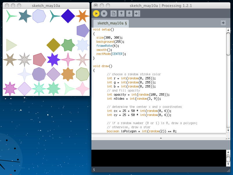 以下の例では、ここまでに作った「polygon()関数」と「star()関数」を使って、リアルタイムにランダムな場所に色々な正多角形や星形を描画する、というなかなかゴージャスなプログラムとなっている。 アプレットとして書き出してみると、このようになった。