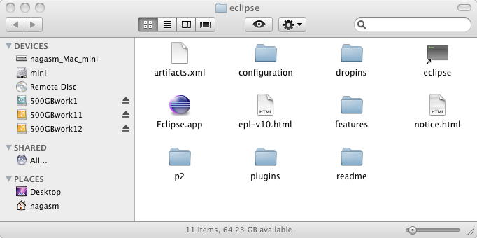 この中の「Eclipse IDE for Java Developers」を選んで進め、とあるが、果たしてMacOSXの「32Bit」なのか「64Bit」なのか、謎である(^_^;)。 とりあえず対応していなければ警告されると予想して、「64Bit」を選んでみると、 筑波のミラーサイトが紹介されて、1分ほどで100MBほどのtar.gzファイルがゲットできた。 これを解凍すると、以下のようにIDE一式が出現した。