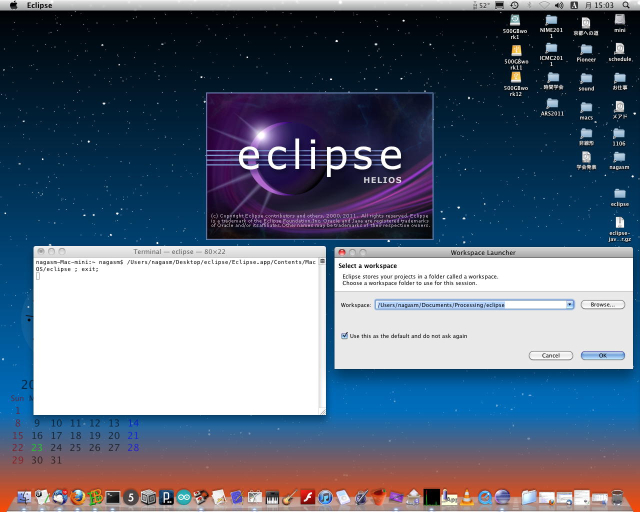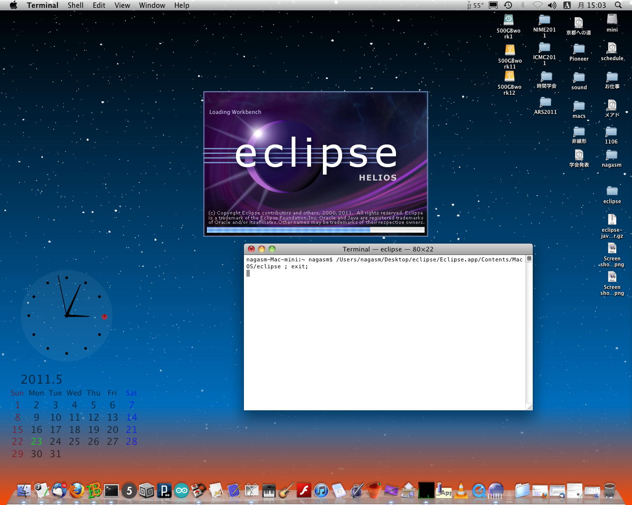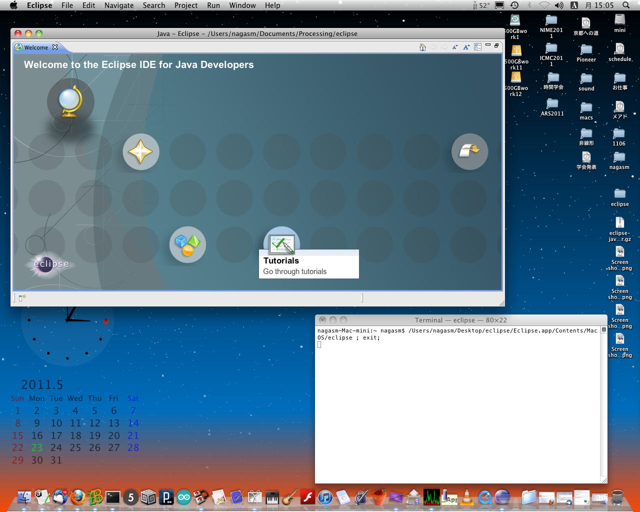 とりあえずこのフォルダをアプリケーションフォルダに入れ、eclipseアブリを起動してみた。 するとターミナルウインドウが出て(これは消えない(^_^;))、さらにデスクトップに「eclipse」というフォルダが現れ、 ワークスペースのディレクトリの設定を求められ、その後、以下のように何やらたくさん設定されて、eclipse画面が起動した。 大文字のEでなく、小文字で始まるeclipseというのが正しい?らしい。