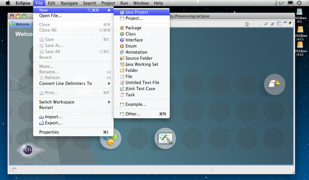 ここまで来て、なんか嫌な予感がしてきた。 どうやらEclipseというのは、10数年前、かつてjava.sun.comのサイトから入手して、 日本語のJava本が1冊も出ていないJava黎明期に僕が独学でJavaを学んだ、あのJDK(Java Developer's Kit)の発展系のIDEなのではないか。 とすれば、このまま乗っていけば、それはProcessingを離れて、Javaの世界に限りなく突入することになる。(^_^;)