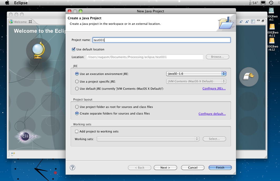 第2ステップ「Create a new project」として、この「Java - Eclipse」ウインドウ(Welcome Screen)をいったんcloseせよ、という。 しかし「Exit?」というメッセージが出て、OKしたら何やらエラーで叱られた(^_^;)。 仕方ないので再びeclipseを起動して、「FILE --> NEW PROJECT and select "Java Project"」とした。 そして以下のようにプロジェクト名を適当に入れて「finish」すると、これでWelcome Screenに戻ったが、もう何もしない。謎である。(^_^;)