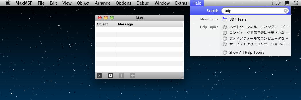 とりあえずMax5を起動して、ヘルプに「udp」と入れてみた。 OSCとはUDPプロトコルを使ったネットワーク情報交換システムなので、たしか「udpsend」「udpreceive」とかだった記憶がある。 すると以下のように、メニューに「UDP Tester」というのがある。 Max5のこういうツールは当然ながらMax5で書かれているので、これを改造すれば、仕組みが判る筈である。
