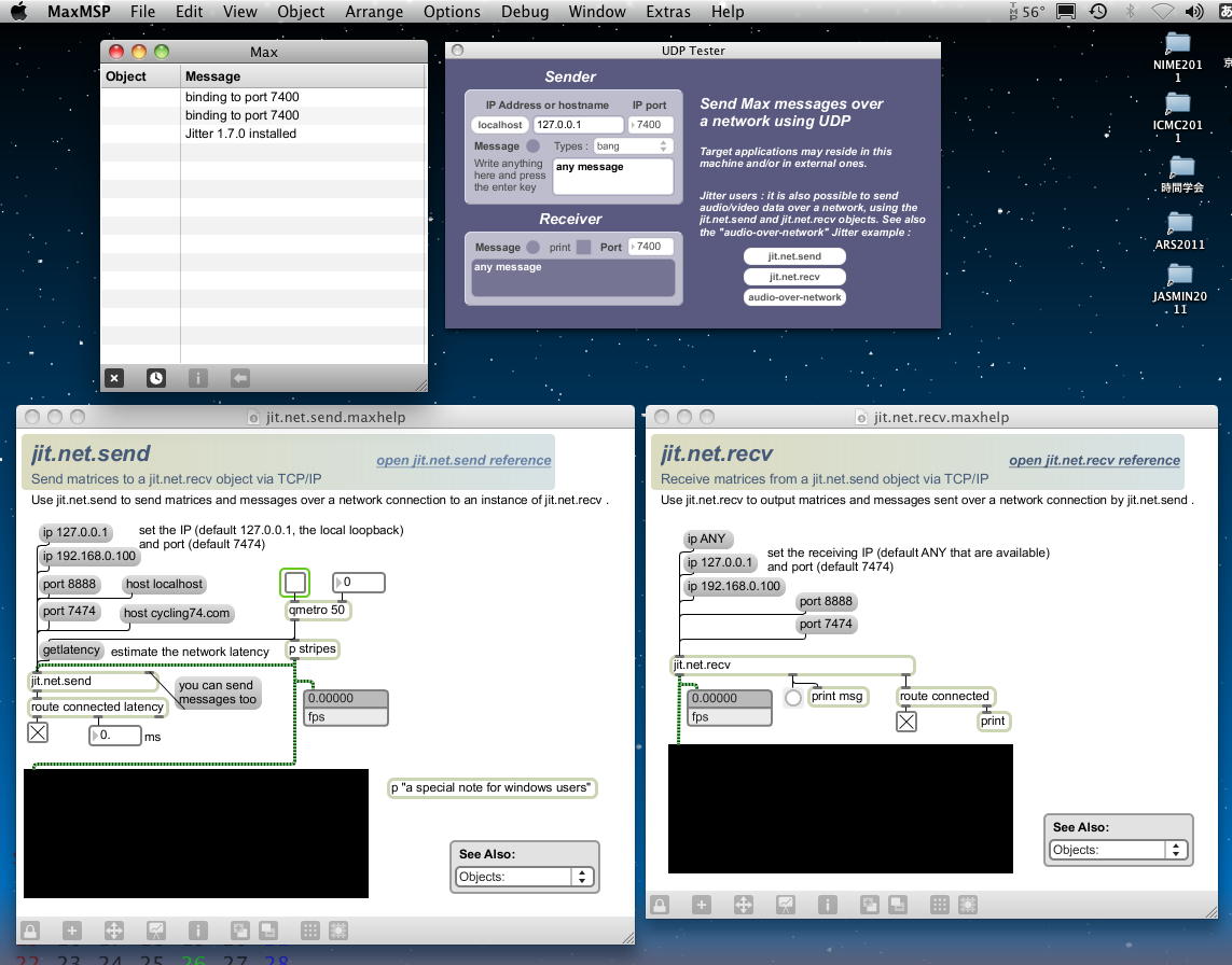 「UDP Tester」を起動してみると、なんとこのツールはedit出来ないようになっていた(^_^;)。 確かそれを外す方法があったが、とりあえず動かしてみると、ちゃんとローカルホストの「127.0.0.1」でメッセージがsendされ、 receiveされていた。 さらにこの中には「jit.net.send」と「jit.net.recv」と「audio over network」というボタンがあり、 前者2つを開いてみると、以下のように、jitterのオブジェクトとして、UDPでなくTCP/IPベースでのsend/receiveと、 さらにオーディオ信号をTCP/IP上で転送するような環境も出来ていた。これは凄い。(^_^)