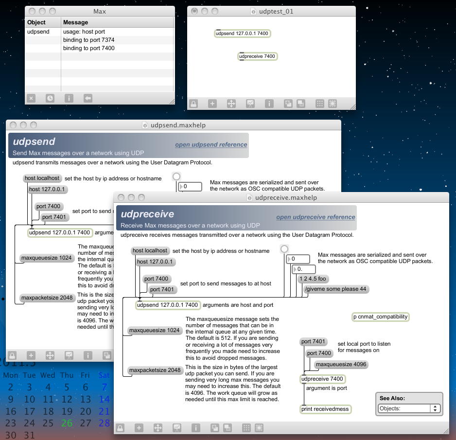 ただし、ここではProcessingやSuperColliderと連携するので、TCP/IPでなくUDPのOSCでないと困るので、 ここもグッとこらえて、とりあえずMax5パッチとして「udpsend」を置いて、以下のようにヘルプを引いてみた。 「udpsend」と「udpreceive」は必ずペアになるので、ヘルプパッチはタイトル以外は同一だった。