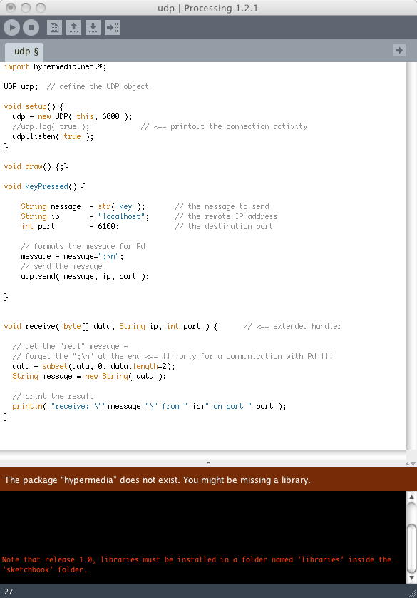 そこで「udp.pde」をダブルクリックして実行すると、Processingが起動し、以下のようにProcessingウインドウが開いた。 解説のコメントが全て入ったオリジナルのソースは これ である。 ところが実行するとエラーが出た。(^_^;)#N canvas 103 333 764 337 10; #X obj 36 28 cnv 15 690 190 empty empty empty 20 12 0 12 -237178 -212212 0; #X obj 36 221 cnv 15 690 70 empty empty empty 20 12 0 14 -146177 -66577 0; #X obj 45 256 print receive; #X text 177 233 <-- Opens a socket for UDP network reception on port 6100 and prints the received message.; #X obj 47 116 netsend 1; #X msg 47 94 disconnect; #X floatatom 47 164 5 0 0 0 - - -; #X text 95 164 <-- Reports whether the connection is open or not (0=close \, nonzero otherwise).; #X obj 242 70 cnv 15 480 60 empty empty empty 20 12 0 14 -259904 -66577 0; #X msg 249 100 send \$1; #X floatatom 249 82 5 0 0 0 - - -; #X obj 45 234 netreceive 6100 1; #X msg 47 72 connect localhost 6000; #X text 314 81 [2] Send the current number to the remote machine (change the value by dragging the number box or type directly the new value). ; #X text 47 40 [1] Connect to 'localhost' on port 6000 for sending UDP messages.; #X connect 4 0 6 0; #X connect 5 0 4 0; #X connect 9 0 4 0; #X connect 10 0 9 0; #X connect 11 0 2 0; #X connect 12 0 4 0;