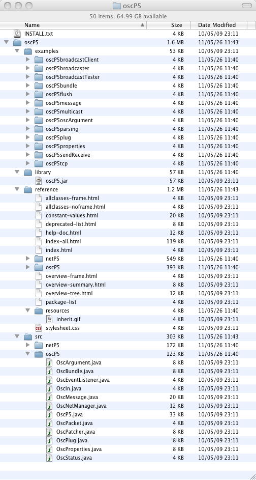 まずはこのサイトの「Download」のところから、 oscP5 version 0.9.6 release 05/09/2010 をダウンロードして解凍してみると、以下のようになっている。