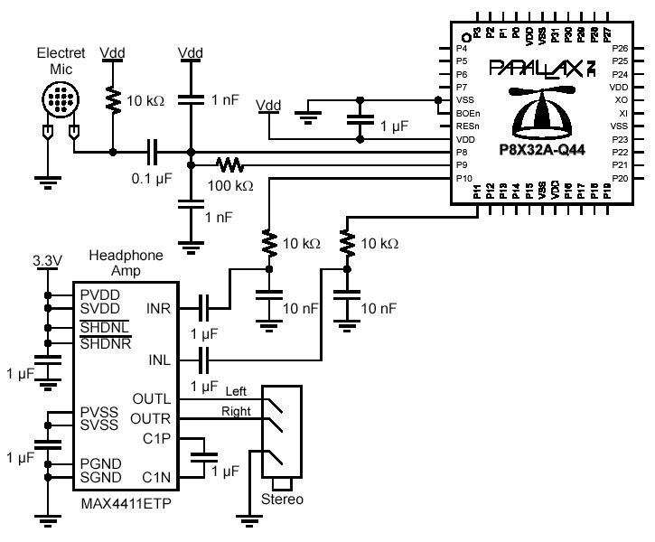 Propeller Demo Boardの回路図のうち、オーディオ入出力の部分は以下である。 この回路で実際にデモが動いているので、オーディオ出力ポートはP10とP11である。 検波・平滑回路というわけでもなく、これでどうやってアナログのオーディオ信号となるのか、 おそらくGAINERと同じようにPWMだろうと予想しつつ、このあたりから調べることになりそうだ。
