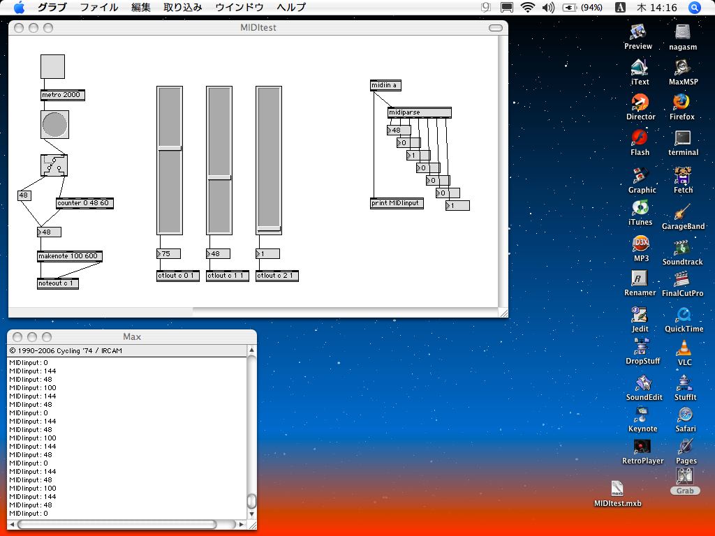 - 実験用パラメータ送信Max/MSPパッチ MIDItest01.mxt