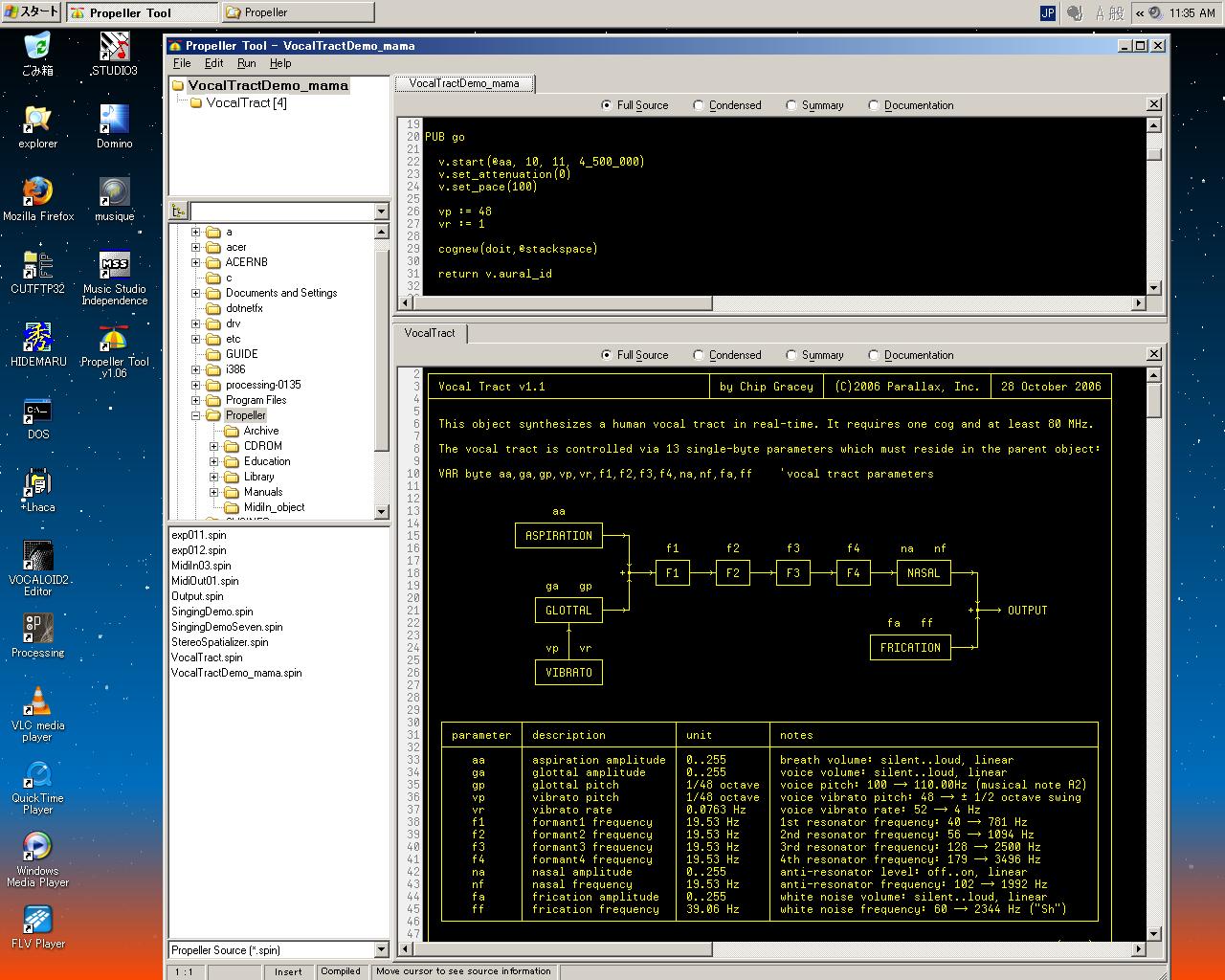 3番目の「Vocal Tract」を調べてみると、歌うプログラムから使われるライブラリとしてだけでなく、 この「話す」機能の単独のデモもあることが判った。 Propeller ToolでVocalTractDemo_mama.spinを指定して、 とりあえずF10でコンパイル・実行してみると、Propeller Demo Boardのヘッドホン端子から出て来たのが、 これ(736KB MP3) である。 これがエンドレスに続く。 これがどうも、見た感じが一番シンプルだったので、以下のように関係のspinソースを全て作業エリアにコピーして、 調べてみることにした。