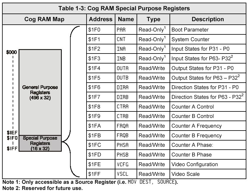 000000 0000 0000 000000001 000000000 との加算、ということになる。 これはつまり、下図のPropeller内部RAMの冒頭のレジスタにおいて、 さっきはアドレス$1F6のDIRAをアクセスしていたのに対して、 destination address(ddddddddd)だけがインクリメントされて、 次のアドレス$1F7のDIRBをアクセスする、という事である。 これがt2に入った定数「#4」だけ繰り返されることで、 Propellerの共有領域に定義されたデータをCog内に、まさに「get dira/dirb/ctra/ctrb」できる。