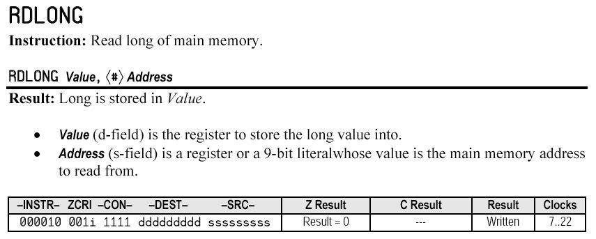 こうなると、Propellerマニュアルのアランブラのリファレンスの中で、 コードをバイナリで分解した解説が必要となってくる。 「rdlong」のところには、