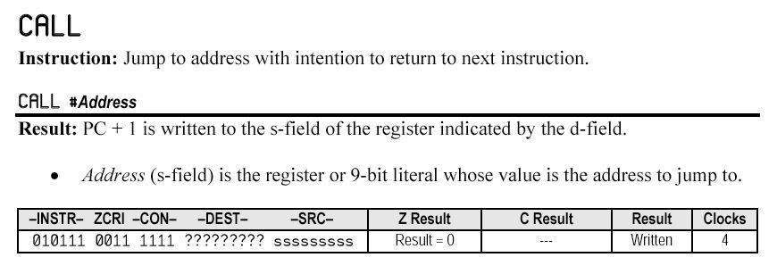 JMPRETPropellerにはCallスタックという概念が無いので、JMPはともかく、 CALLについてはかなり不思議な動作をする。 CALL命令を実行する際には、CogはそのCALL先のラベルに対して、RETの置かれた「ラベル_RET」を探す。 そしてRET(これはPropellerではJMPの一種)のsourceフィールドに、CALL命令の直後のアドレスを書き込んで、 CALL先にJMPする。 CALL先では、最後にRETがあれば、これを書き換えられたJMPとして実行することで、 CALLの置かれた場所の次のインストラクションに戻って来るのだという。 実際、RETとJMPのインストラクションビット(opcode)は一致している。Instruction: Jump to address with intention to “return” to another address.