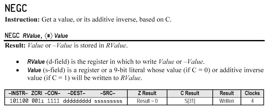 sub t1,t2 wc 'get next-current delta with sign in c negc t1,t1 'make delta absolute (by c, not msb) rcl vscl,#1 wz, nr 'save sign into nz (vscl unaffected)「sub t1,t2 wc」は「t1 - t2 を t1に」なので、 13種類のそれぞれのパラメータごとに「next値からcurrent値を引いてt1に」ということである。 ここでの減算は値をUnsignedとして行われる。 いずれの数値も最上位1バイトに置かれているので、結果の下位3バイトは全てゼロである。 t1はデルタ値(差分値)となり、サインビットはマイナスになった時に立つ。 その次のNEGCは、