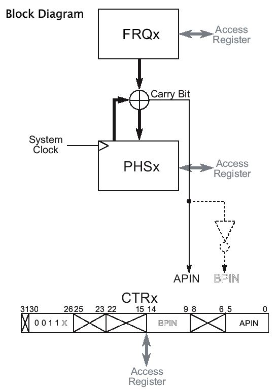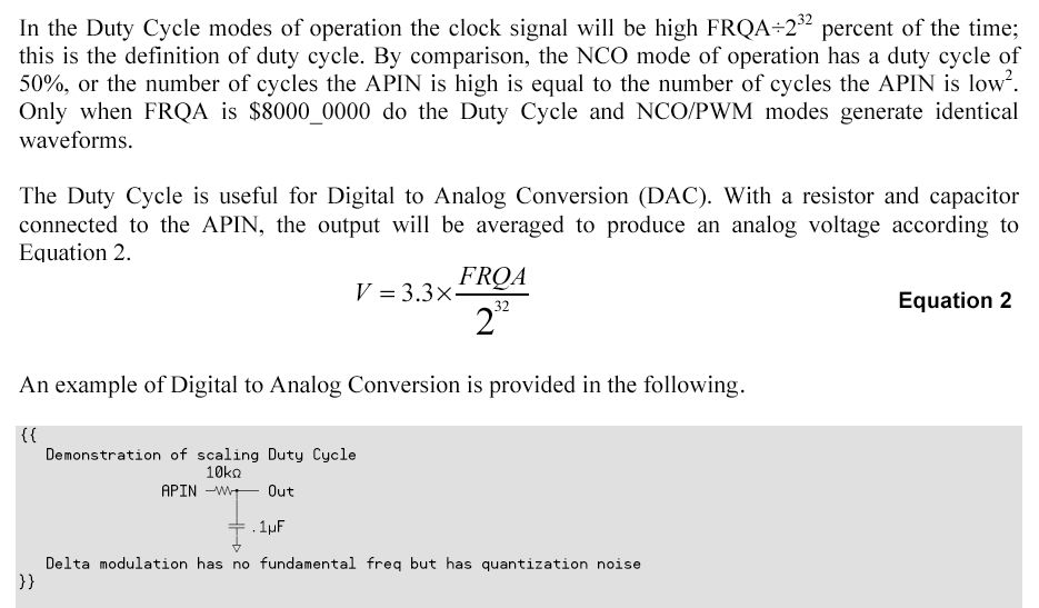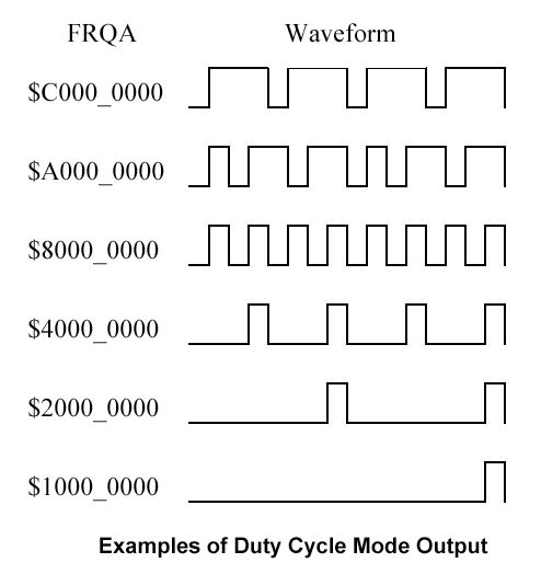 Duty Cycle modes of operationModes %00110 (DUTY single-ended) and %00111 (DUTY differential) on the surface appear similar to the NCO/PWM modes of operation; however the waveforms they produce are very different. The output of the Duty Cycle modes is the carry output of the PHSA register, whenever the PHSA register overflows (wraps around from $FFFF_FFFF to $0000_0000) the APIN is set to 1. The block diagram for this mode of operation is shown in Figure 9. If FRQA is $0000_0001, the carry bit of PHSA will be 1 only once every 2^32 (4,294,967,296) cycles. At an 80MHz system clock, this will occur approximately once every 54 seconds. Similarly if FRQA is $FFFF_FFFF, the carry bit of PHSA will be 0 only once every 2^32 cycles.