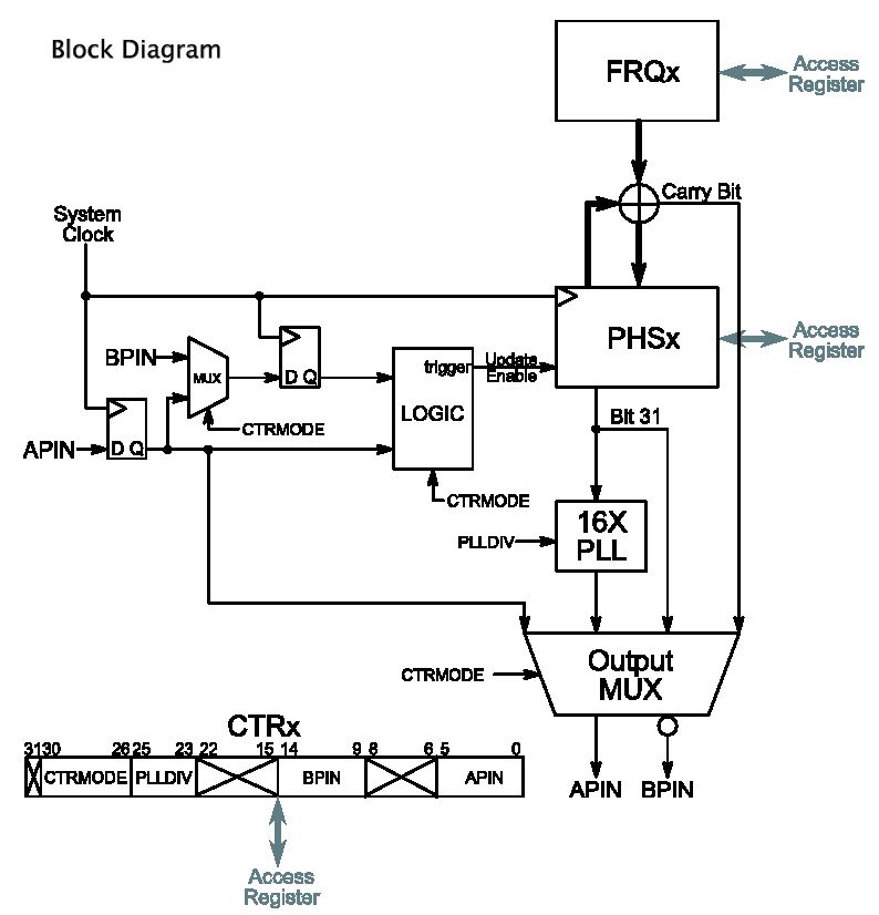 ここでいよいよ、Webでダウンロードしていた このマニュアル の出番となった。 Propellerの各Cogsが持つ、強力であるというカウンタを理解する必要がでてきた。 その全体のブロック図は以下のようなものである。