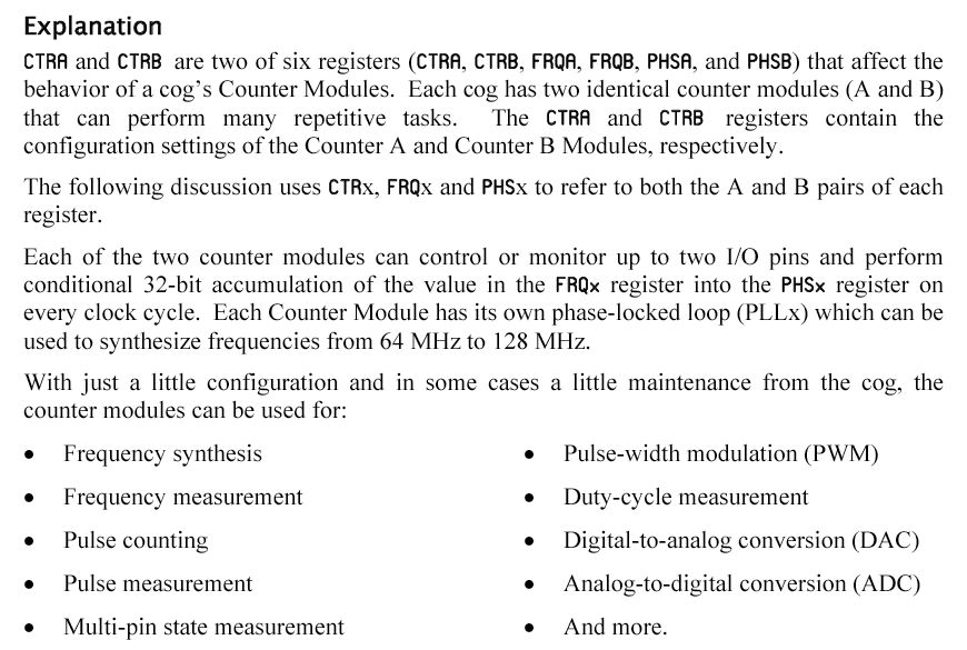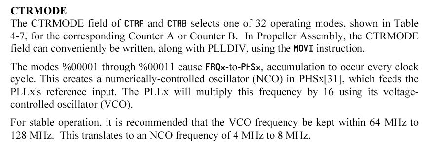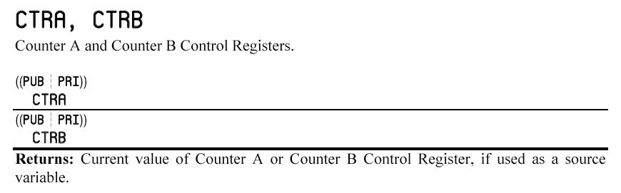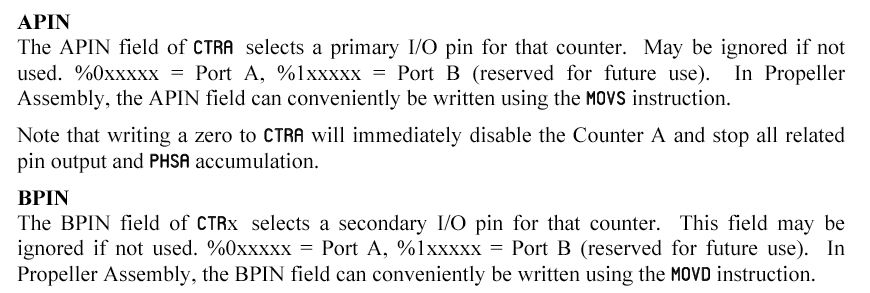 さて、昨日の続きである。 VocalTractオブジェクトの中のstartメソッドの、 以下の初期化の部分はまさに、サウンド出力の「肝」だったのである。 これをたまたま見落としていたのは偶然とはいえ、凡ミスであった。 まぁ、そのお陰でPropellerのアセンブラにだいぶ慣れてきたので、 損な回り道ということでもないだろう。ctrb_ := $18000000 + pos_pin & $3F ctrb_ += $04000000 + (neg_pin & $3F) << 9Propellerマニュアル のCRTBのところを見ると、PropellerのCog内のカウンタ/タイマ関係について、 以下のように詳細に書かれていた。 オーディオ出力はシリアルなのだから、絶対にカウンタ/タイマを使っている筈なのである。 まず、CRTA/CRTBのspin解説として