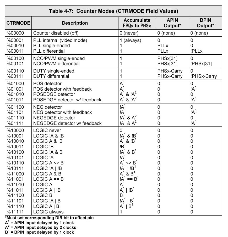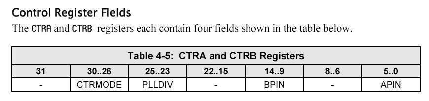 ctrb_ := $18000000 + pos_pin & $3F ctrb_ += $04000000 + (neg_pin & $3F) << 9ということは、最上位1バイトについて言えば、0001 1000 + 0000 0100 = 0001 1100となる。 bit31は無視なので、bit30..26の5ビットのCTRMODEは00111である。 2バイト目はゼロなので、bit25.23の3ビットのPLLDIVは000である。 「pos_pin & $3F」の意味は、将来的な64ビットのPropellerのためにマスクしているだけなので、 これは単にpos_pinであり、これがbit5..0に置かれる。 neg_pinは同様に9ビット左シフトした位置のbit14..9に置かれる。 それぞれのピンの意味は以下である。