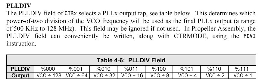 従って、以下のPLLDIVは000なので、「VCO / 128」が出力されることになる。