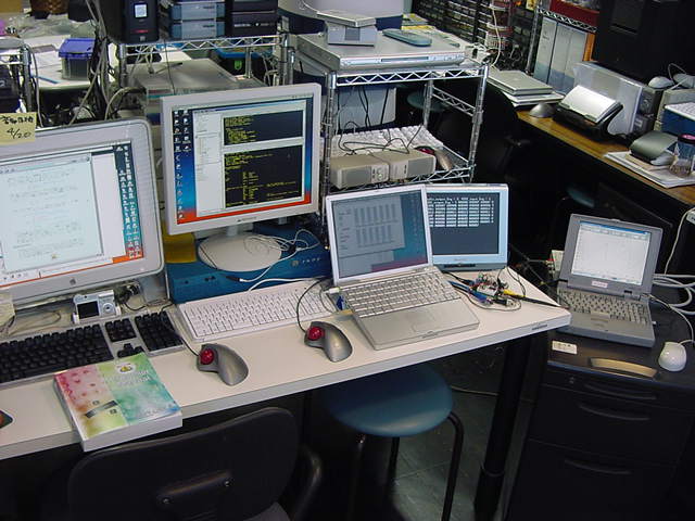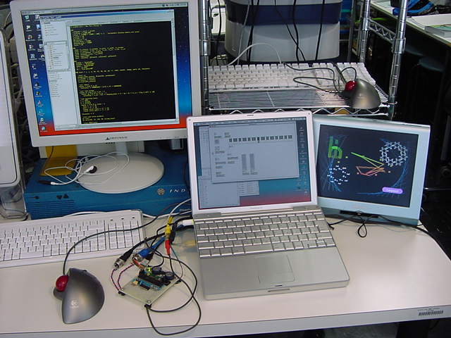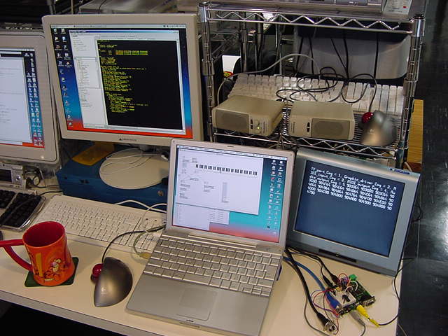 プローブが電圧を1/10にしているので、ちゃんとp-pで2.5Vぐらいは出ているようだ。 もう片方のチャンネルからは、もちろん極性反転した信号が出ていた。 以下が、この実験の様子である。 Propellerの小さなボードが、4台のパソコンに囲まれている風景である。
