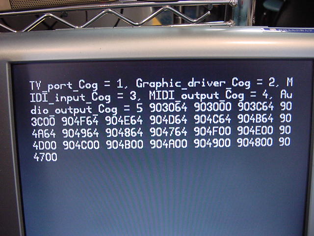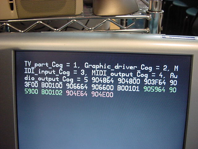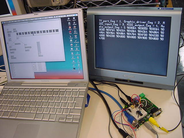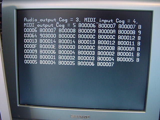 OBJ midiIn : "MidiIn03" midiOut : "MidiOut01" v : "AudioOut06" PUB Main | dummy, para, p1 TV.Str(string("Audio_output_Cog =")) dummy := v.start(24,25) TV.Str(Num.ToStr(dummy, Num#DEC)) TV.Str(string(", MIDI_input_Cog =")) dummy := midiIn.start(27) TV.Str(Num.ToStr(dummy, Num#DEC)) TV.Str(string(", MIDI_output_Cog =")) dummy := midiOut.start(26) TV.Str(Num.ToStr(dummy, Num#DEC))そして、以下のように無事にここまでは動いた。 まだビデオ出力は無いので、Max/MSPからMIDIを出して、 それがPropellerのソフトスルーでMIDIとして戻ることで確認した。