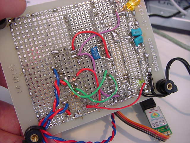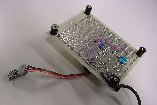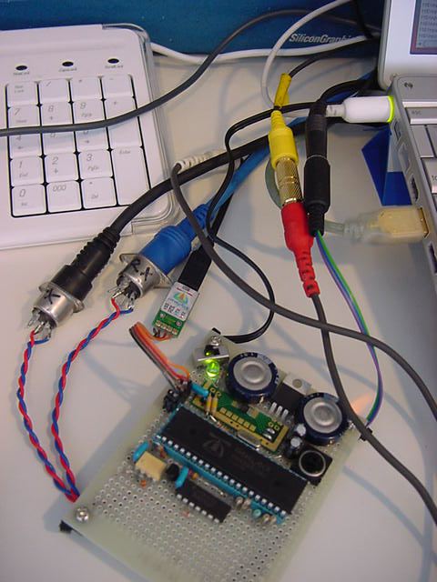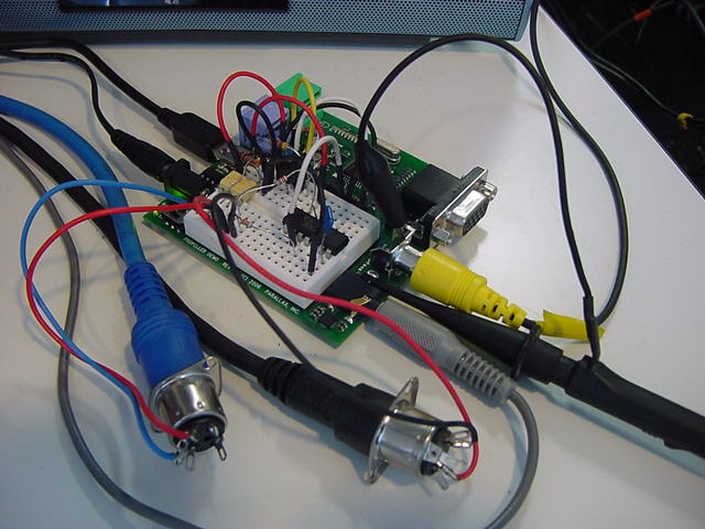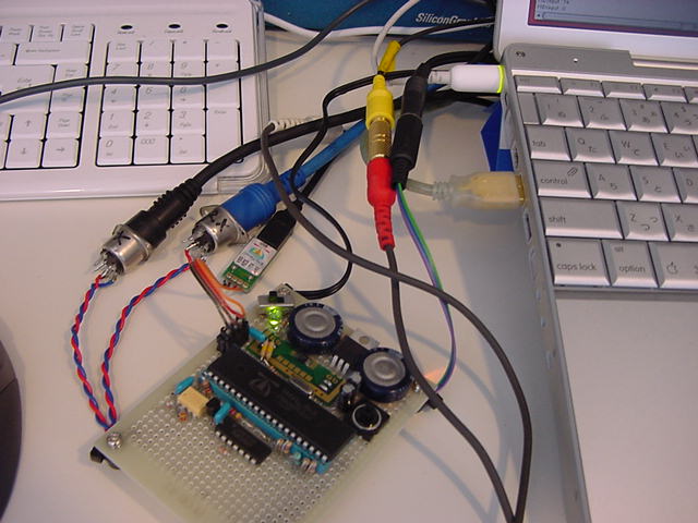 システムの方針が決まったので、試作基板の製作を続けることにした。 最終的には使わないとしても、せっかくオリジナル外付回路を作ったので、 MIDI INとMIDI OUTも製作し、目玉としてビデオ出力回路を2チャンネル、搭載することにした。 同時に2系統の異なる映像信号を生成するシステムというのは、パソコンでもなかなか大変だが、 Propellerであればもう1つのCogを映像生成に指定するだけの筈である。 オーディオはヘッドホンアンプでなく、ステレオミニジャックからのライン出力である。