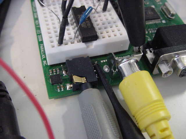 これに続いて、オーディオと、2系統のビデオ出力の回路を増設した。 オーディオは、とりあえずPropellerの出力から4.7KΩで受けて、GNDへは0.1μF、出力へは10μFで出した。 マニュアルとかのドキュメントによって、だいぶ数値のばらつきがあり、抵抗では10KΩと220Ωの両方の記事があった。 ビデオのピンの位置については、以下のように定義した。 片方をPropeller Demo Boardと同じにして、他のポートを8ビット単位で空けておくためである。