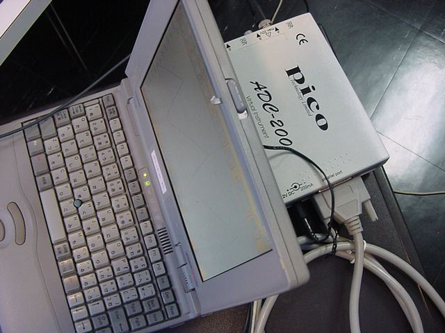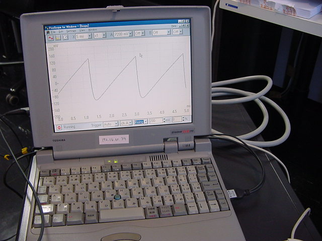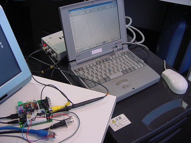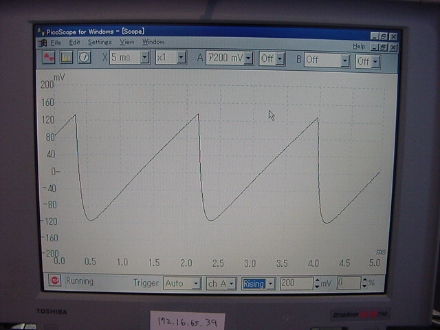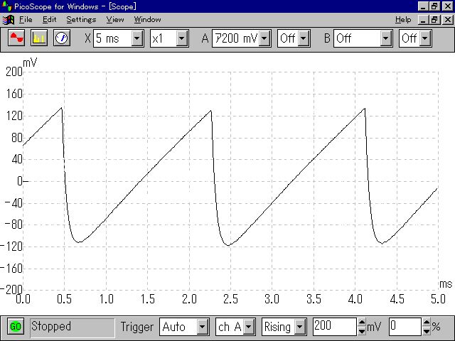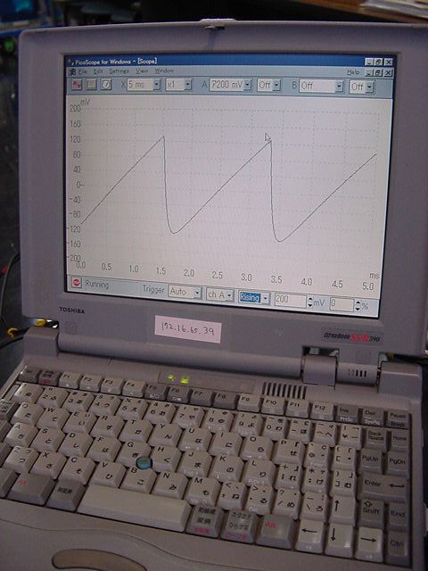 せっかくなので波形を見てみようと、数年ぶりにWindows95のノートを発掘して、 秋月電子で買ったオシロを繋いで、このアナログ出力波形を見てみることにした。 バッテリが寿命で再リセットとかが必要だったが、無事に動いて、 オシロのスクリーンショットをサーバに転送できた。 波形は以下のようなものである。
