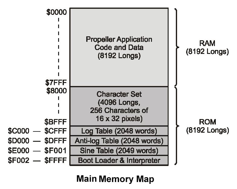 sine shr t2,#32-13 'get 13-bit angle test t2,h00001000 wz 'get sine quadrant 3|4 into nz test t2,h00000800 wc 'get sine quadrant 2|4 into c negc t2,t2 'if sine quadrant 2|4, negate table offset or t2,h00007000 'insert sine table base address >> 1 shl t2,#1 'shift left to get final word address rdword t2,t2 'read sine word from table negnz t2,t2 'if quadrant 3|4, negate word shl t2,#15 'msb-justify resultPropellerマニュアルによれば、メインメモリ中のサインテーブルは以下のように2049「ワード」、 すなわち16ビット幅である。 アドレスは$E000-$F001である。 1/4周期なので、最初のゼロ値から1/4周期で、終端の最大値まで持つために端数が出るわけである。