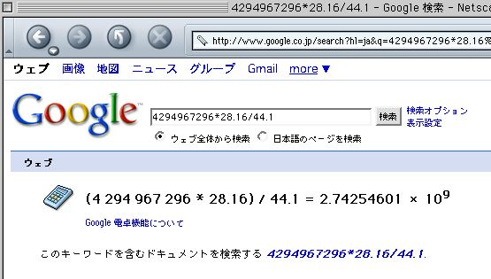 $100000000 : 44.1 = x : 28.160 となり、以下のGoogle電卓の計算によって、「x = 2742546010」という整数値を得た。